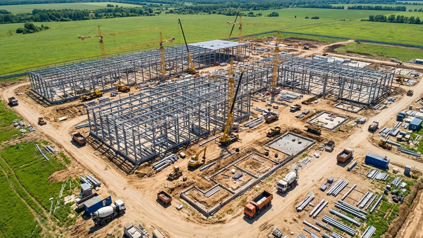 Таймлапс в чистом поле. Быстрое возведение корпусов огромного завода. Появление логотипа (вид сверху).