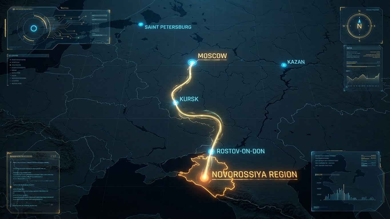 Вид сверху. Инфографика маршрута: Москва -> Курск -> Новороссия. Точки загораются на карте.